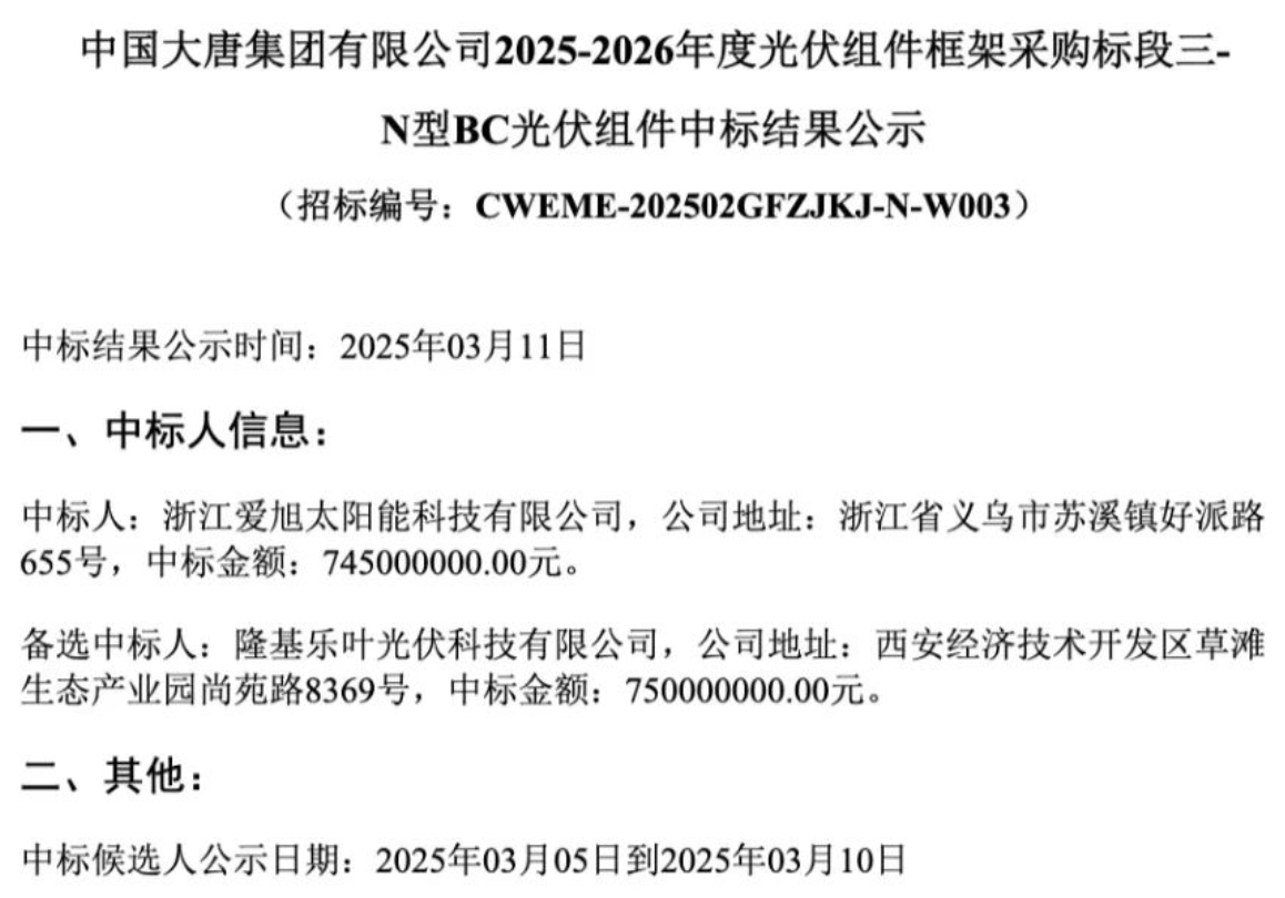 日前,大唐集团公示2025—2026年度光伏组件框架采购中标结果。爱旭凭借N型ABC组件的至高效率、可靠品质及创新技术等优势,以第一中标人身份成功中标“N型BC光伏组件”标段,标段容量为1GW,标志着爱旭国内集中式业务取得新的重大突破。