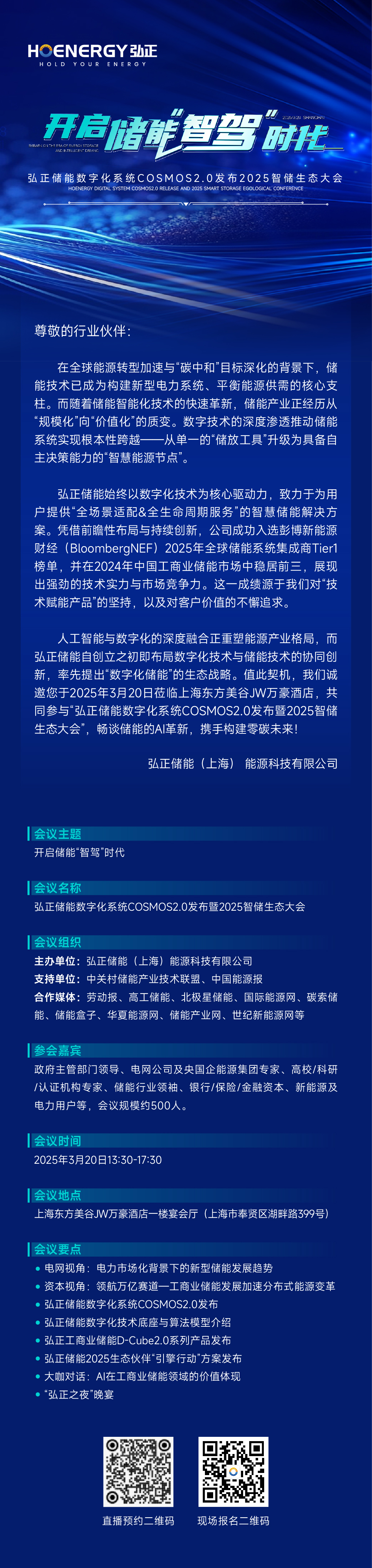 一场引领数字储能技术革新、重构智慧能源价值链条的行业盛会即将启幕!弘正储能将于3月20日在上海隆重召开数字化系统COSMOS2.0发布暨2025智储生态大会,诚邀全球能源领域同仁共襄盛举。