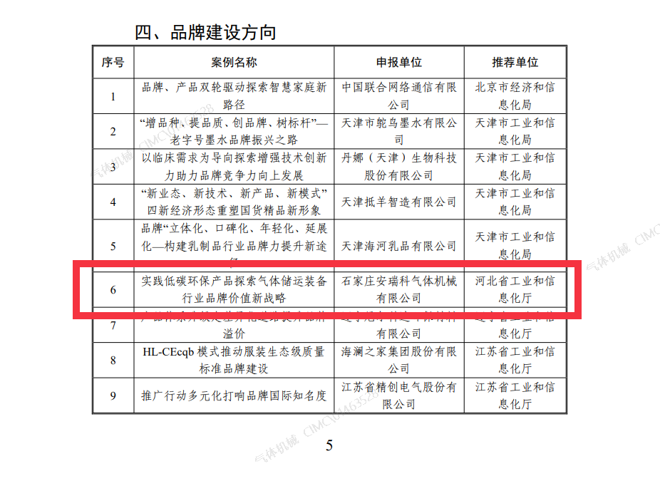 1月10日,工业和信息化部公布了“2024年度质量提升与品牌建设典型案例名单”,石家庄安瑞科气体机械有限公司的“实践低碳环保产品探索气体储运装备行业品牌价值新战略”的案例及在质量提升与品牌建设方面的卓越表现,成功入选品牌建设方向典型案例。这一荣誉不仅是对石家庄安瑞科在气体储运装备行业领先地位的肯定,也是对石家庄安瑞科坚持低碳环保、绿色发展理念的的高度认可。