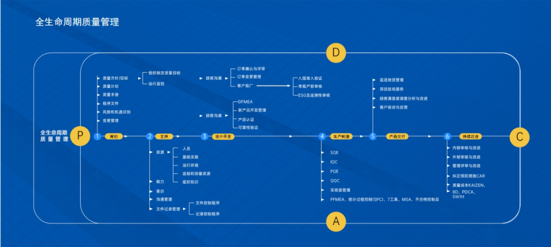 为此,晶澳科技擘画了全生命周期质量管理体系蓝图,旨在整个生命周期内,对产品或服务的质量进行持续监控和管理,以确保终端市场的高质量体验。在此背景下,晶澳科技从战略规划与经营计划、产品与服务开发管理、智能制造、精益管理、采购与外包管理、交付及售后服务等多环节同时发力,不断完善质量责任机制,最终建立了一套覆盖设计开发、采购、生产、监测、出货、运输、运维等全产业链的质量管理体系。