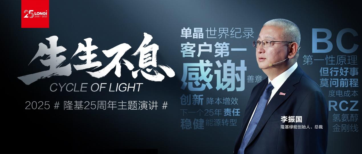 2月14日,隆基绿能科技股份有限公司(以下简称“隆基”)迎来了其成立的第25个年头。在这个重要的里程碑时刻,隆基创始人、总裁李振国发表了一场主题为“生生不息”的演讲,回顾了隆基的发展历程,展望了隆基未来的绿色能源发展蓝图,并向所有支持隆基成长的人们表达了最诚挚的感谢。