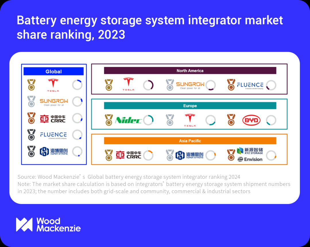 全球知名咨询机构伍德麦肯兹(Wood Mackenzie)发布的《全球电池储能系统集成商排名2024》(Global battery energy storage system (BESS) integrator rankings 2024)显示,2023年,特斯拉以15%的市场份额位列全球第一。特斯拉不仅缔造了全球最畅销的乘用车型Model Y,是全球规模最大的新能源纯电车企,同时还是全球最大的电池储能系统集成商,储能业务持续保持高速增长。
