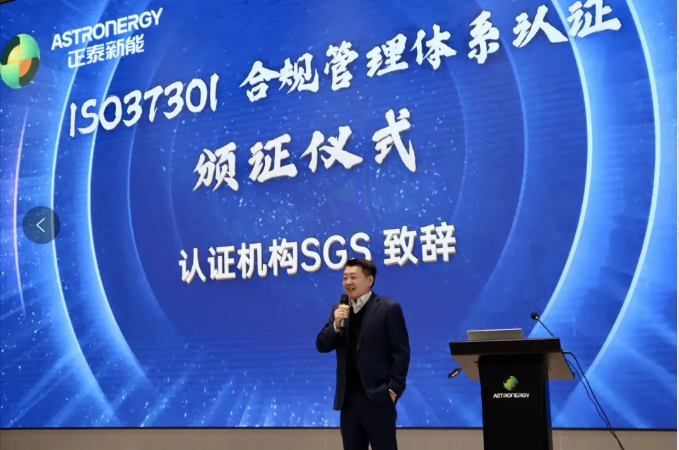 12月31日,正泰新能在零碳报告厅成功举行合规管理体系认证证书颁发仪式。本次仪式标志着正泰新能科技股份有限公司及海宁正泰太阳能科技有限公司正式通过了ISO 37301:2021合规管理体系的认证,成为光伏行业中率先获得该国际标准认证的企业之一。