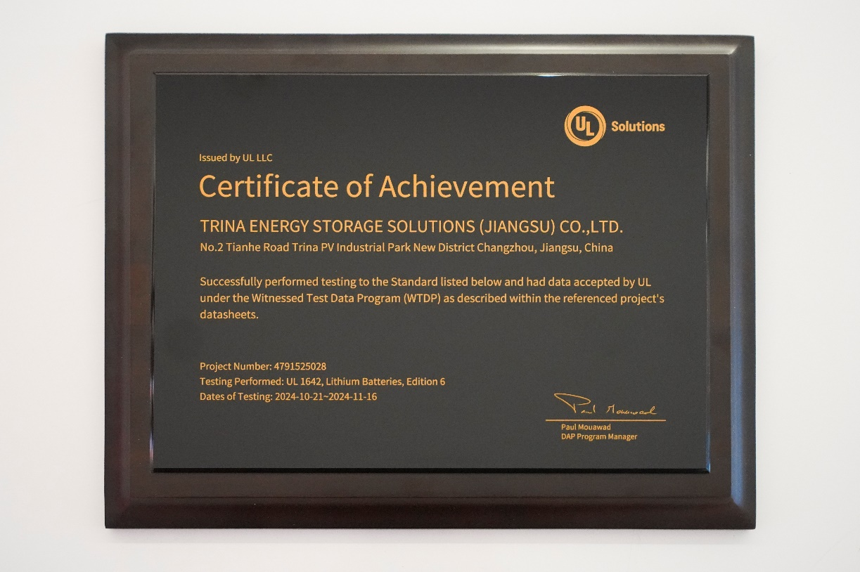 早在去年,天合储能便已取得了UL关于电池舱热失控测试的“UL9540目击实验室”资质,成为国内第二家获得该认证的企业。同时,公司还通过了TÜV、CNAS和CQC等多家权威机构的实验室资质认可。本次获颁“UL 1642目击测试实验室”认证,意味着天合储能可利用自身更强大的检测资源,完成储能产品现场资格测试。这不仅有效缩短了新产品的认证周期,还全面提升了认证效率和客户服务质量,为产品快速导入市场提供了有力支撑。