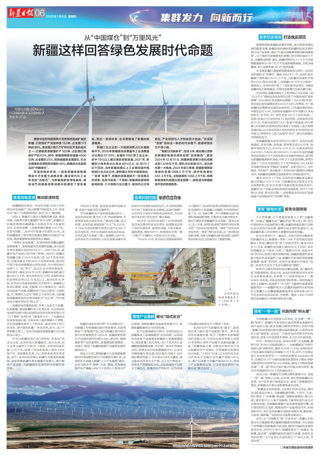 1月9日,新疆维吾尔自治区委员会机关报《新疆日报》刊登文章《从“中国煤仓”到“万里风光”,新疆这样回答绿色发展时代命题》。结合新疆近日实现可再生能源装机历史性突破的里程碑节点,立体化、多维度地呈现了新疆近年来一系列绿色发展成果。与此同时,文章也重点介绍了金风科技作为生于新疆、扎根新疆、建设新疆的可再生能源企业,积极担当“链主企业”角色,与新疆风电乃至中国风电产业同频共振的建设贡献,赞扬了金风“以绿色能源作笔,为新疆回答时代命题”的标兵精神。