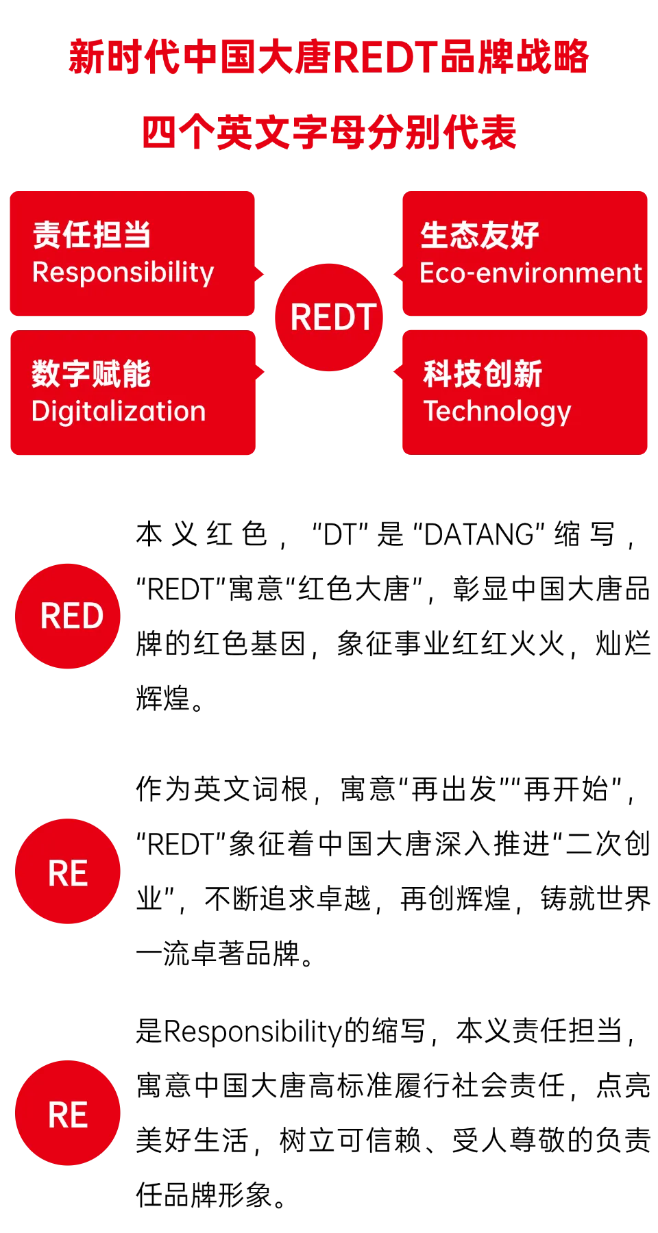 进入“十四五”以来,中国大唐保持战略定力、加强文化凝聚,把品牌建设作为一种价值引领,推动绿色低碳转型取得新进展,价值创造能力实现新提升,重点科研攻坚实现新突破,治理能力实现新跃升,党的建设不断开创新局面,“红色品牌”的底色更浓,“金字招牌”的成色更足。中国大唐董事、总经理、党组副书记张传江表示,REDT品牌战略是在中国大唐“1264”战略引领下,继中国大唐新时代卓越文化发布之后,为加快打造卓著品牌,全面推进世界一流能源供应商建设推出的又一重要举措。