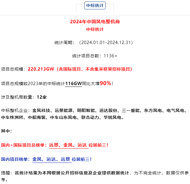 以上统计数据为每日风电根据公开招标信息及企业提供数据统计,为不完全统计,每日风电会严格审核所有项目数据。每日风电严格遵守对客户的信息保护义务,本文所涉客户项目内容均取自公开信息或取得客户同意。全文内容、观点仅供参考,不代表每日风电任何立场,亦不应当被视为出具任何形式的法律意见或建议。以上统计数据在任何时候均不构成对任何人的具有针对性的、指导具体投资的操作意见,订阅者应当对本公众号中的信息和意见进行评估,根据自身情况自主做出投资决策并自行承担投资风险。每日风电对本公众号所载资料的准确性、可靠性、时效性及完整性不作任何明示或暗示的保证。对依据或者使用本公众号所载资料所造成的任何后果,每日风电及/或其关联人员均不承担任何形式的责任。本公众号中所有资料的版权均为每日风电所有,未经书面许可任何机构和个人不得以任何形式转发、转载、翻版、复制、刊登、发表、修改、仿制或引用本公众号中的内容。
