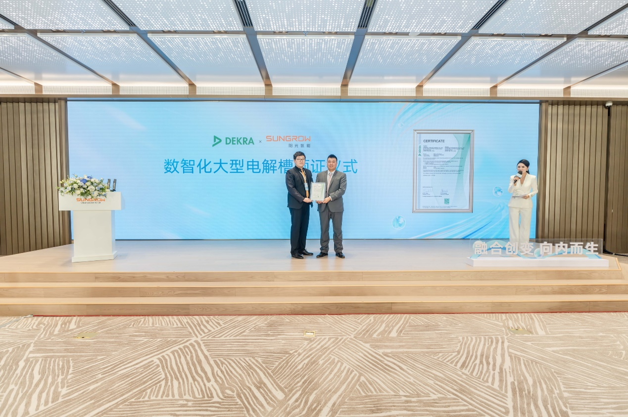 现场嘉宾一行来到20MW水电解制氢实证基地,近距离参观此次发布2000+Nm³/h电解槽的运行状况,感受产品的“数智”能力。该实证基地已获得TÜV莱茵颁发的目击实验室资格证书。截至目前,这款电解槽已在实证基地稳定运行了1000小时以上,并由国内权威的第三方认证机构DEKRA德凯进行了全面测试。会上,德凯可再生能源组件及氢能总监路一鸣公布了各项测试数据,并为阳光氢能颁发了产品认证证书。