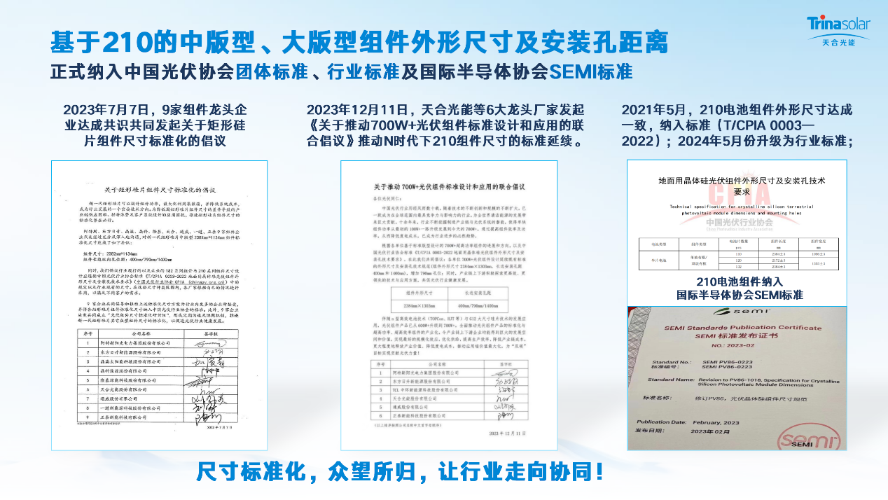 作为210的坚定推动者和引领者,天合光能积极倡导组件尺寸标准化,减少组件尺寸频繁迭代带来行业困扰。基于210的中版型、大版型组件外形尺寸及安装孔距离,正式纳入中国光伏协会团体标准、行业标准及国际半导体协会SEMI标准。