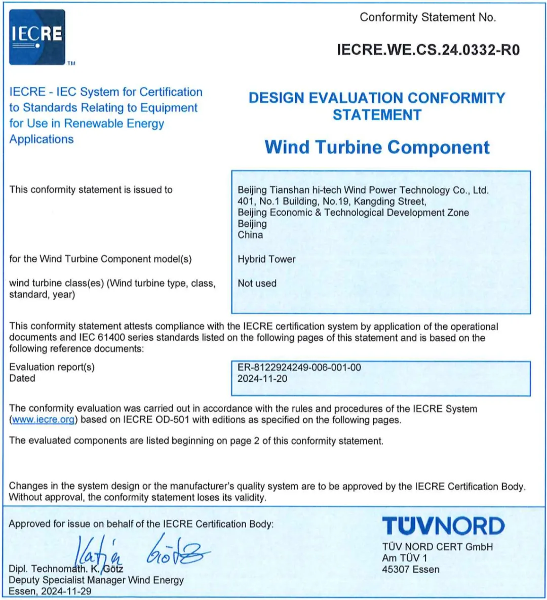 近一年来,金风混塔技术与产品多次获得国际权威机构认可。2024年7月,金风科技获得了国内首个DNV欧标工厂制造评估证书,并与鉴衡认证联合发布《中国陆上钢混塔架白皮书》;2024年10月,国际权威认证咨询机构UL Solutions为金风科技子公司天杉高科颁发了中国首个风电混塔可融资性报告证书。而此次获得TÜV NORD权威认证,是金风持续深化混塔技术研究的再次印证。