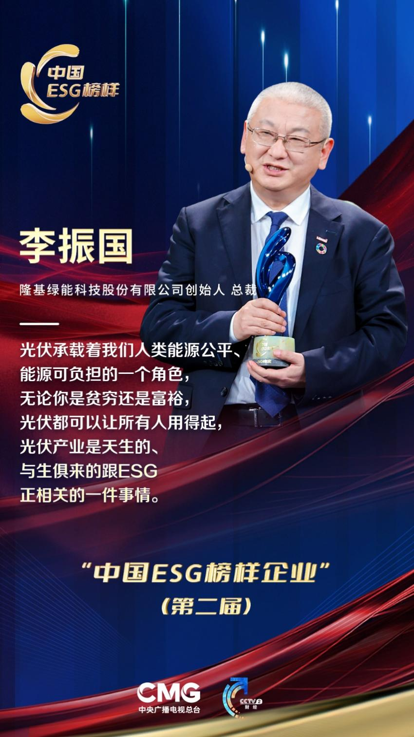 隆基绿能创始人、总裁李振国出席活动并表示,隆基荣获“中国ESG榜样企业”并不只是简单的隆基一个企业入选,而是代表中国光伏行业登上该榜单。