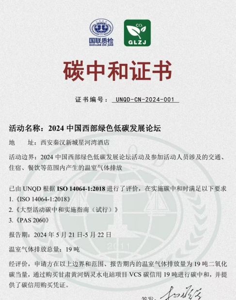 据悉,本次论坛为《陕西省大型活动碳中和实施指南(试行)》发布后首次举办的500人以上大型活动,通过购买甘肃黄河炳灵水电站项目 VCS 碳信用19吨进行碳中和,并提供了碳信用购买凭证。