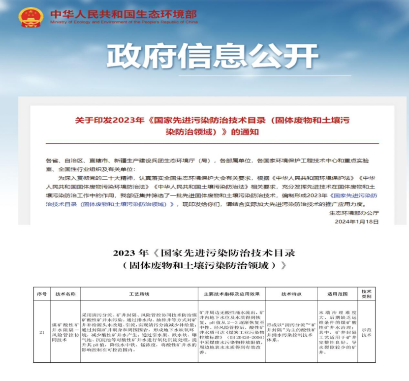 近期,生态环境部发布了2023年《国家先进污染防治技术目录(固体废物和土壤污染防治领域)》(以下简称《目录》)。由清新环境子公司四川省天晟源环保股份有限公司(简称“天晟源环保”)自主研发的“煤矿酸性矿井水阻隔-风险管控协同技术”成功入选该目录。