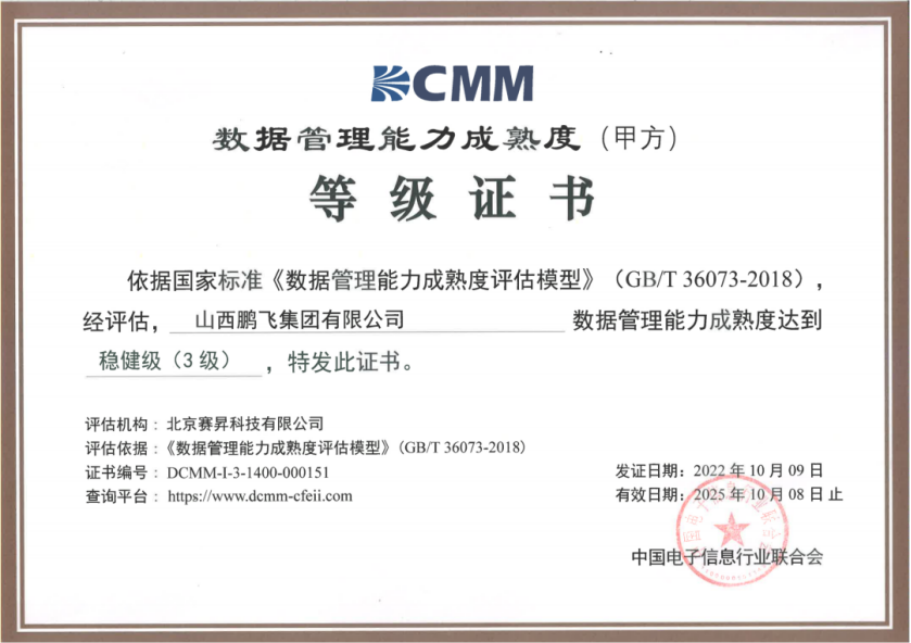 多年来,鹏飞坚持传统产业现代化、现代产业高端化升级变迁,紧跟国际国内数字化发展趋势,持续推动工业智能化运用,取得显著成效。2022年被工信部评为山西首家DCMM认证企业、两化融合行业最高等级3A级认证;2023年被工信部评为工业互联网示范企业;2024年被工信部评为新一代信息技术与制造业融合发展示范企业,旗下鹏飞焦化、甲醇制造、郑旺制氢三家工厂荣获山西省智能制造示范标杆,成为行业领先的数字化建设示范企业。