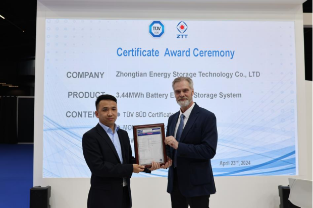 大会期间,中天科技发布了大型储能、高压直流海缆、大容量输电三大领域的下一代新产品及系统解决方案,为全球能源高效转型提供了技术装备支撑。发布会上,中天储能科技有限公司获得TÜV南德液冷储能系统认证并达成战略合作。
