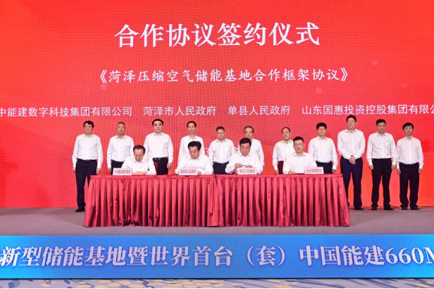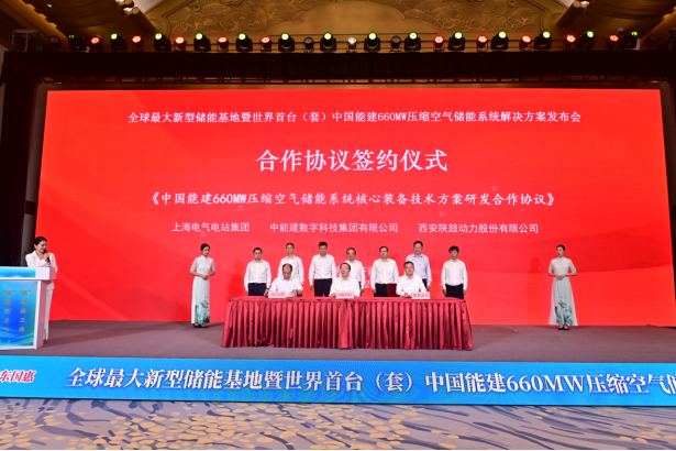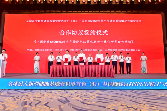 会上,中国能建数科集团发布《世界首台(套)中国能建660MW压缩空气储能系统解决方案》,介绍了中国能建在山东省建设3060MW储能基地的规划布局及赋能“西电东送”新图景,并与山东国惠、中国石油渤海钻探公司、陕西动力、上海电气电站集团等项目合作企业签订了《中国能建660MW压缩空气储能系统核心装备技术方案研发合作协议》等三项合作协议,标志着围绕压缩空气储能的又一“政企合作、央地共建”典范项目正式吹响集结号。