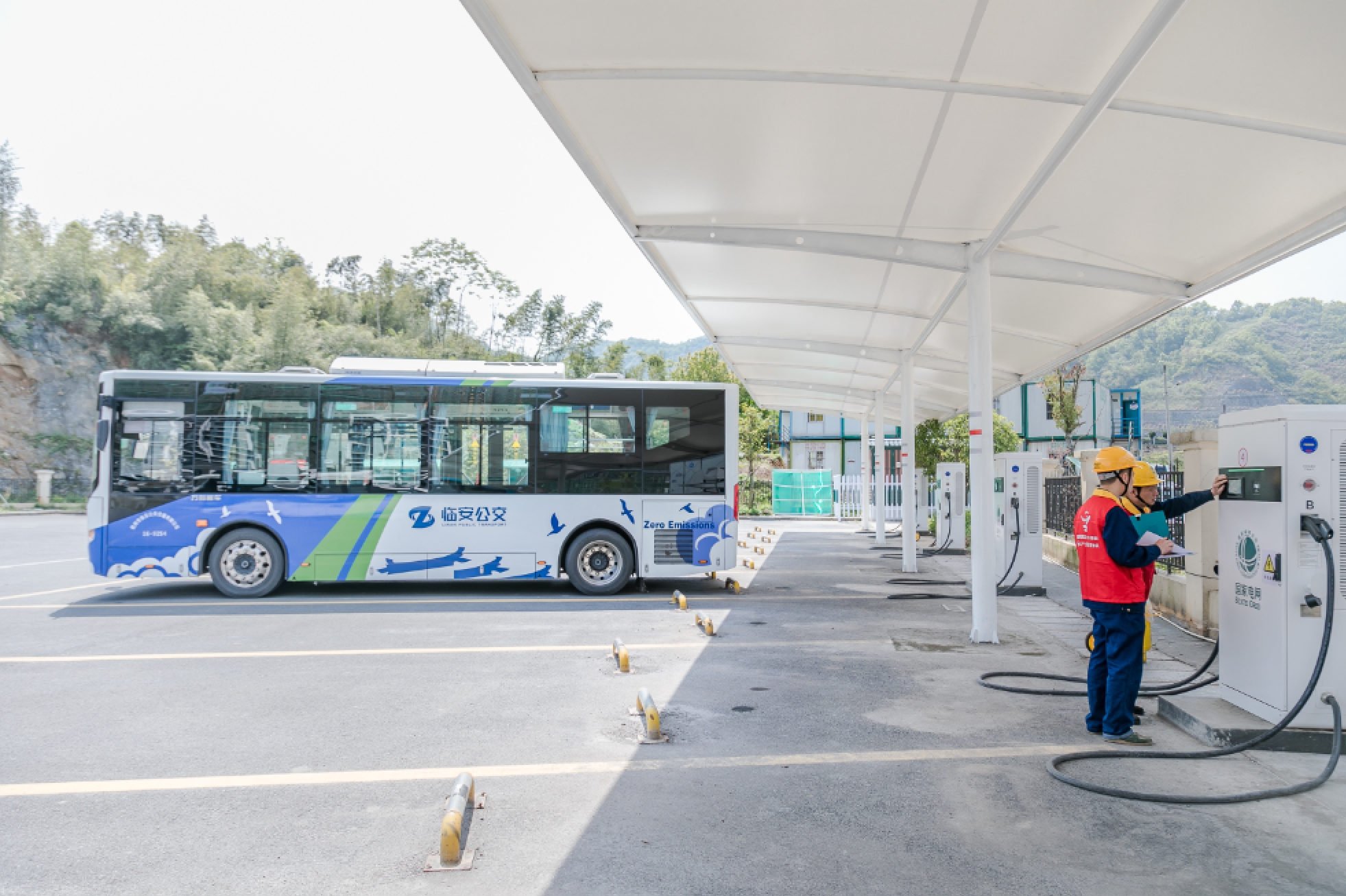 国网浙江电力员工对临安汽车北站公共充电站设备进行检测。郭芳/摄