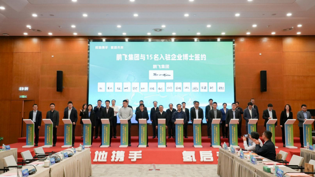 杜朝辉、冯光源、郑鹏代表校地企三方签署合作协议。山西鹏飞集团与15位入驻企业博士现场签约。