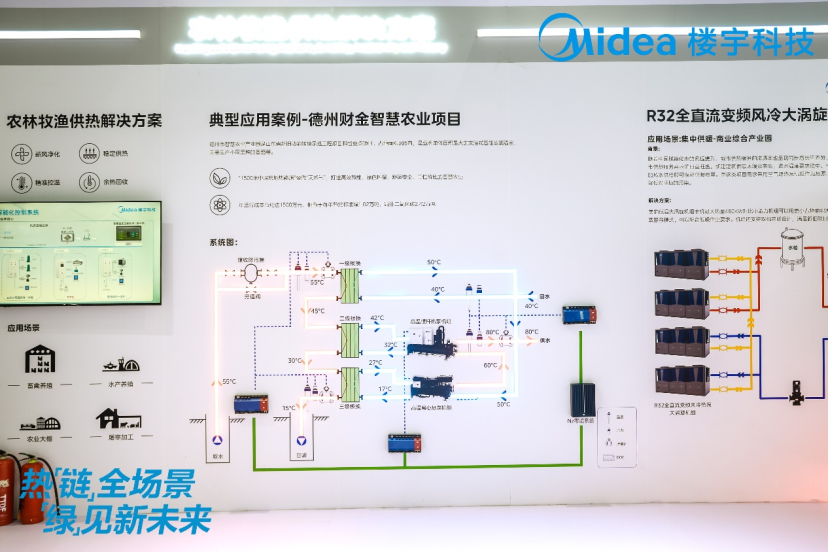 目前,美的高温热泵已在区域能源中心、工业厂房、农业园区、小区集中供暖、办公楼宇、商业建筑、节能改造等多元场景广泛应用。以德州财金智慧农业产业园项目为例,该园区作为亚洲单体面积最大的文洛式智能玻璃温室,其大棚内要保证24小时温度保持在20℃以上,过去主要依靠天然气锅炉供暖,为帮助其转变供热方式,实现节能降本,美的楼宇科技采用“中深层地热能源”替代天然气进行能源改造,通过7台美的鲲禹高温热泵机组结合美控智慧能源综合解决方案,一个产季节约的能源成本就达到1500万元,相当于每年节约标准煤1.02万吨,减少碳排2.42万吨,助力农业园区高效转型升级。