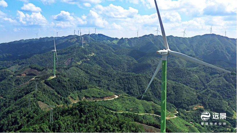 在乡村风电的落地实践方面,远景也走在行业前列。广西苍梧六堡风电(一期)项目,一个安装了20台远景能源EN-141/2.5MW智能风机的“现象级”乡村风电项目,目前已成为集风力发电、观光旅游、环保示范于一体的风电长廊。自2020年投产以来,苍梧六堡项目始终维持高效稳定运行,年发电量超1.17亿千瓦时,每年可为村集体经济创收300万元左右。结合当地六堡茶的产业特色,项目采用的远景风机塔筒喷涂了茶叶花纹彩绘图案,升压站采用了古韵十足的建筑风格,并配套设计建造了观景凉亭,现已成为每年国际茶博会举办期间全球茶友必来的网红“打卡地”。该项目的建成有效带动了沿途茶叶、柑橘等农产品的销售,并催热了农家乐、乡村游等第三产业。