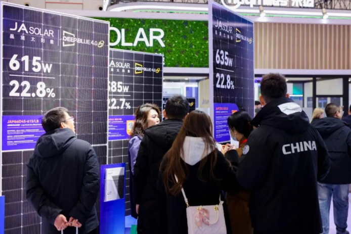 在本次展会中,晶澳科技展出了新一代n型高效DeepBlue 4.0 Pro系列产品。DeepBlue 4.0 Pro系列产品由晶澳科技秉持“量产一代,储备一代,研发一代”的产品策略,坚持“为客户价值而生”的产品设计理念,于2023年推出。该系列产品采用晶澳科技自主研发的n型高效Bycium+钝化接触电池、SMBB和高密度封装技术,组件的量产功率达635W,实现了更高功率和效率。同时,更低的衰减、更优的温度系数、更高的双面率和更好的弱光表现带来了更好的发电表现,搭配优异的可靠性能,产品具有更低的BOS成本和LCOE,有效提升了客户价值。