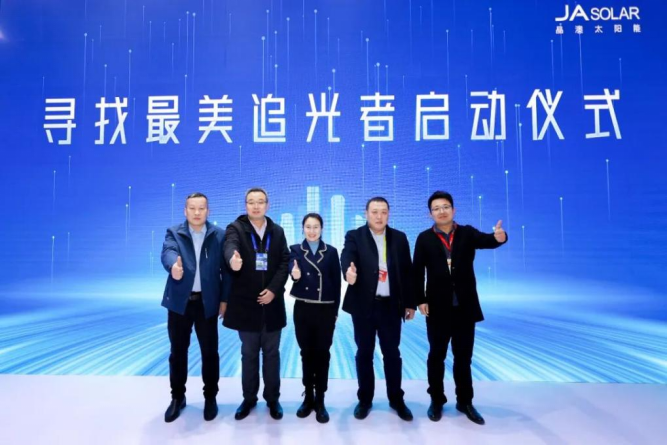 随后,晶澳科技助理总裁张凤海,与来自双杰新能有限公司、德州交投新能源有限责任公司、山东聚辉新能源集团有限公司、安宇光伏能源集团有限公司的代表一起上台,共同启动寻找最美追光者活动。