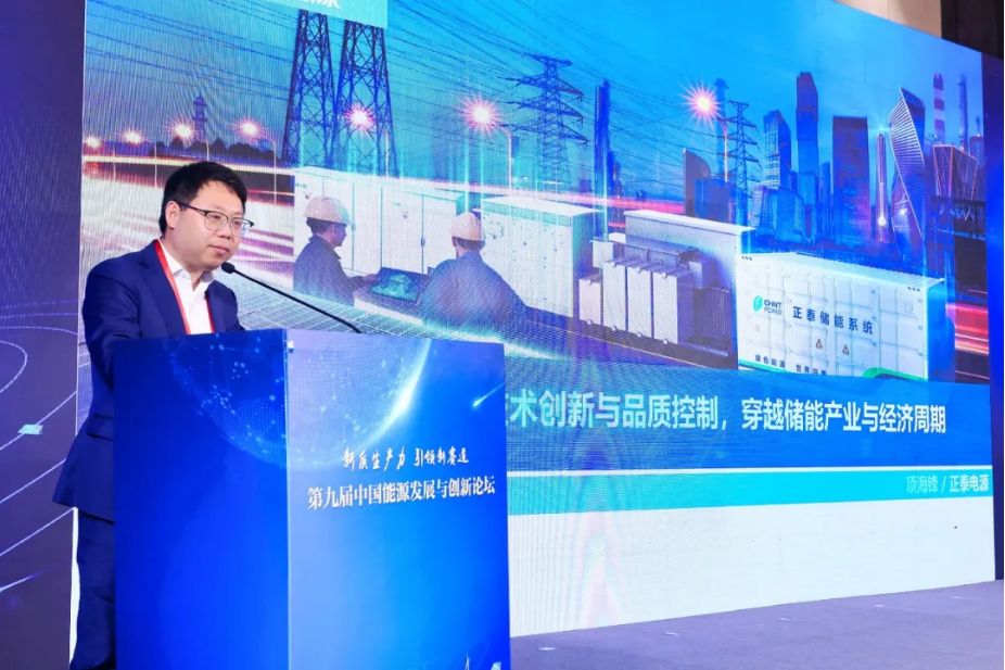 近日,由中国产业发展促进会、北京国发智慧能源技术研究院共同主办的第九届中国能源发展与创新论坛在北京举行。论坛以“新质生产力 引领新赛道”为主题,邀请行业主管部门、研究机构、领军企业及试点项目相关代表,就如何构建多能融合互补的新型能源体系,布局风、光、储、氢等新能源技术试点示范和产业链合作,探讨氢基绿色燃料技术与未来趋势等重点议题展开深入讨论。正泰电源副总经理项海锋受邀出席风光储先进技术分论坛,发表《坚持技术创新与品质控制,穿越储能产业与经济周期》主题演讲。