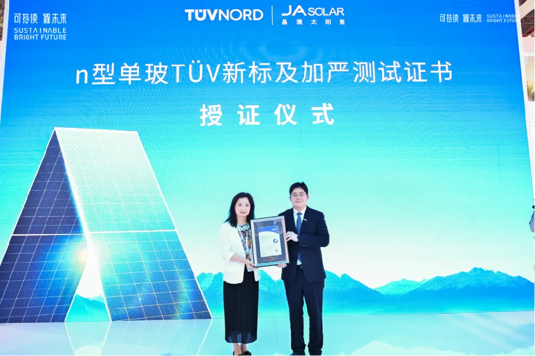 在此基础上,TÜV NORD全球可再生能源高级副总裁、全球智慧能源中心总裁、大中华区副总裁须婷婷为晶澳科技单玻防积灰产品颁发了“n型单玻TÜV新标及加严测试证书”,再次印证了晶澳科技一以贯之的稳健可靠品质。