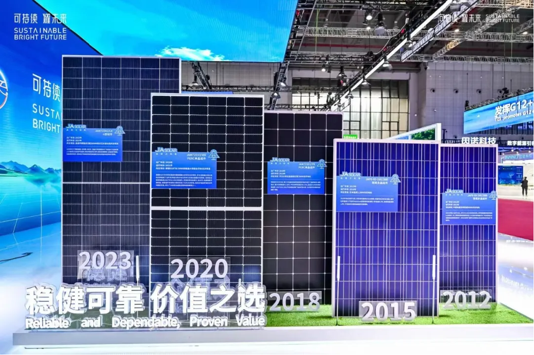 自2010年完成组件业务布局以来,晶澳科技坚持以产品质量开拓市场,进而成就品牌。在本次展会上,晶澳科技以十年时间为轴,展示了不同年份组件所支持的项目案例,以事实彰显了始终如一的可靠性。