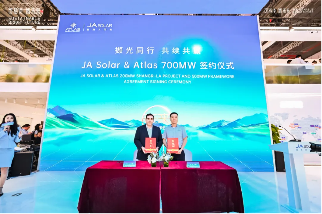 首先,拉丁美洲最大的太阳能开发商和投资者之一Atlas与晶澳科技签署了总规模达700MW的组件供货协议,其中包括为香格里拉项目供货200MW组件的协议,以及围绕哥伦比亚项目的500MW战略合作框架协议。Atlas采购主管Patrick Valentin 与晶澳科技副总裁、全球营销中心总经理祝道诚分别代表双方签字。