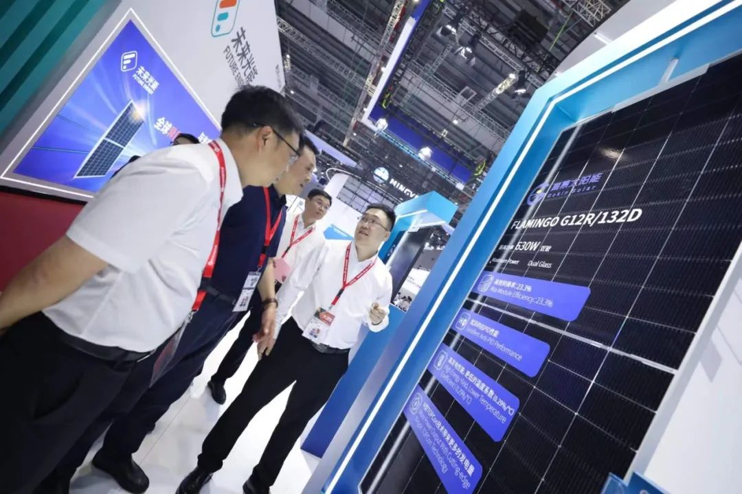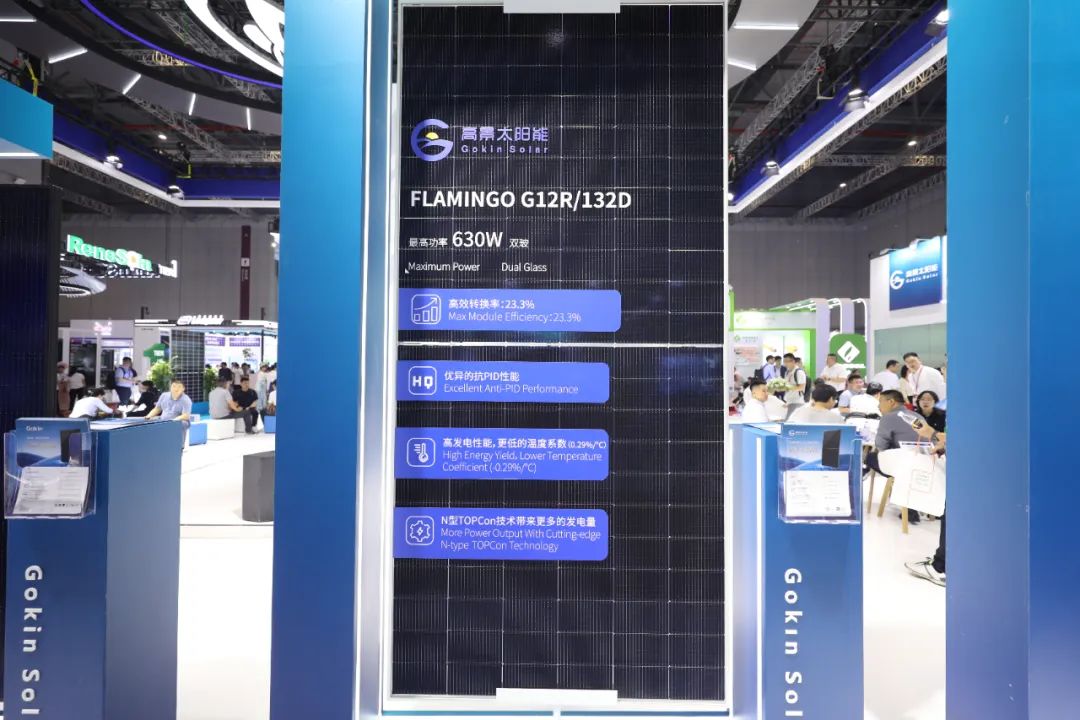 Flamingo-R系列组件是高景基于N型TOPCon技术路线下的“明星产品”,其独特设计和更加优异性能在展会期间引得无数国内外来宾驻足洽谈。该系列组件基于182*210mm超薄大尺寸硅片技术和高密度封装技术联袂打造而成,相比于传统方形片,超大尺寸矩形片设计深入触达用户需求,功率提升30W+,海外运输装船量提升 3.5%+,有效降低国内外客户的BOS成本,使度电成本(LCOE)更优、综合发电效益更高,让终端客户在电站的全生命周期内持续受益。