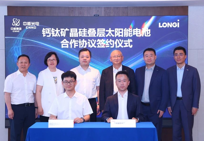 6月14日,SNEC第十七届国际太阳能光伏与智慧能源(上海)大会暨展览会期间,中国核能电力股份有限公司(简称中国核电)旗下中核光电科技(上海)有限公司与隆基绿能签署钙钛矿晶硅叠层太阳能电池合作协议。中国核电党委书记、董事长卢铁忠,隆基绿能创始人、总裁李振国等出席签约仪式。