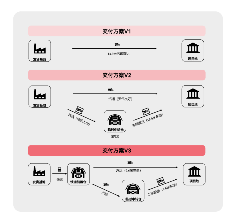 最开始采用的方案一,是从发货基地汽运直抵项目地,发货基地为安徽滁州和江苏泰州组件中心,该方案的执行周期为今年1月到3月。