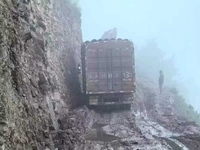 一辆载满隆基绿能光伏组件的货车,正沿着泥泞的盘山小路,小心翼翼地尽力贴近靠山一侧缓缓前行。一名工作人员全神贯注地指挥着车辆走向,确保每一步都稳健安全。