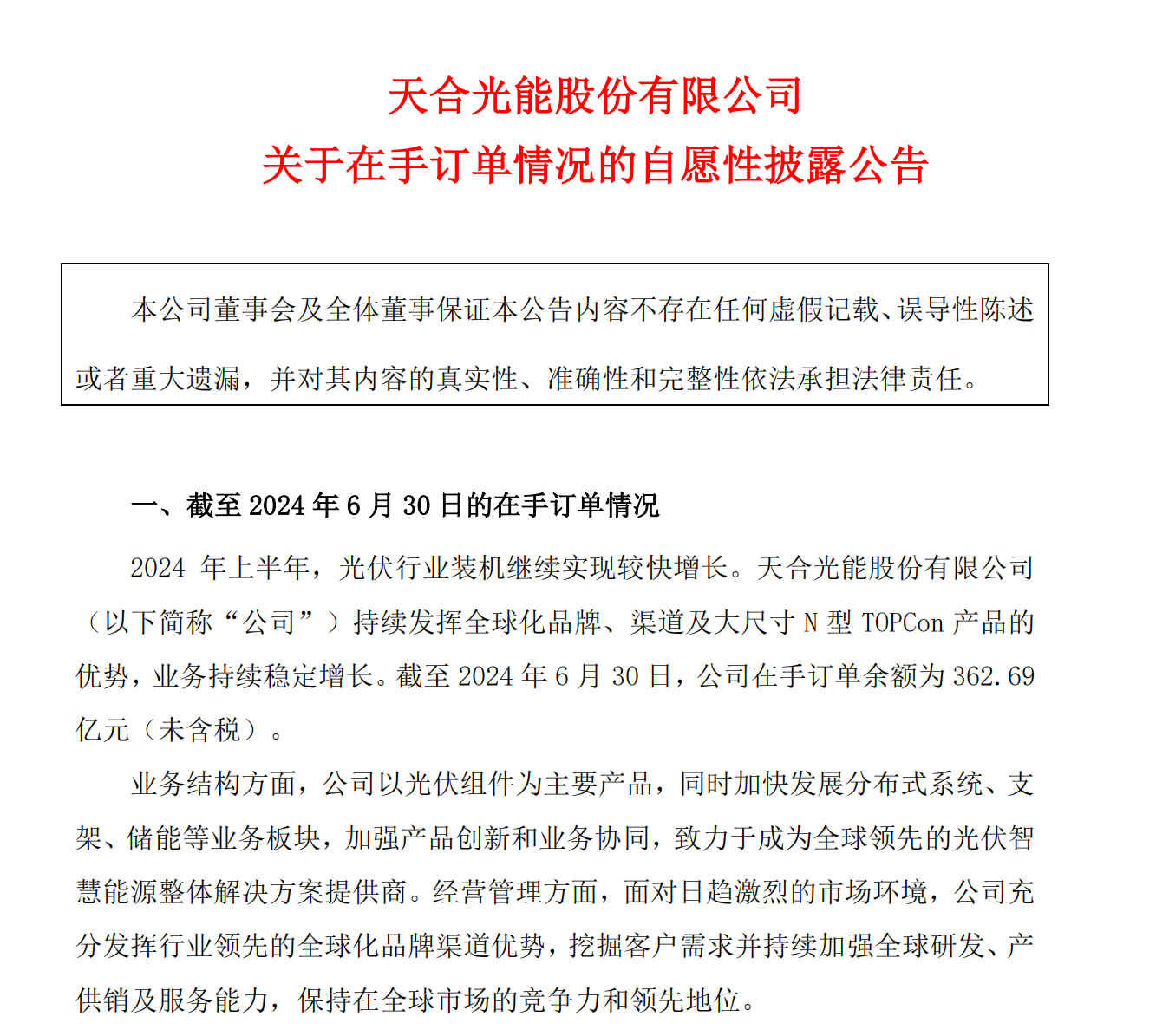 近日,天合光能股份有限公司 (以下简称“天合光能”)公告显示,2024年上半年,光伏行业装机继续实现较快增长。天合光能股份有限公司持续发挥全球化品牌、渠道及大尺寸N型TOPCon产品的优势,业务持续稳定增长。截至2024年6月30日,在手订单余额为362.69亿元(未含税)。
