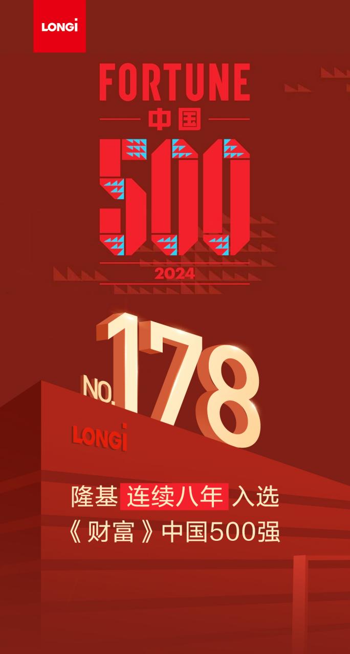 7月25日,财富中文网发布2024年《财富》中国500强排行榜,隆基位列第178位,自2017年首次入选榜单以来,公司已经连续八年上榜。