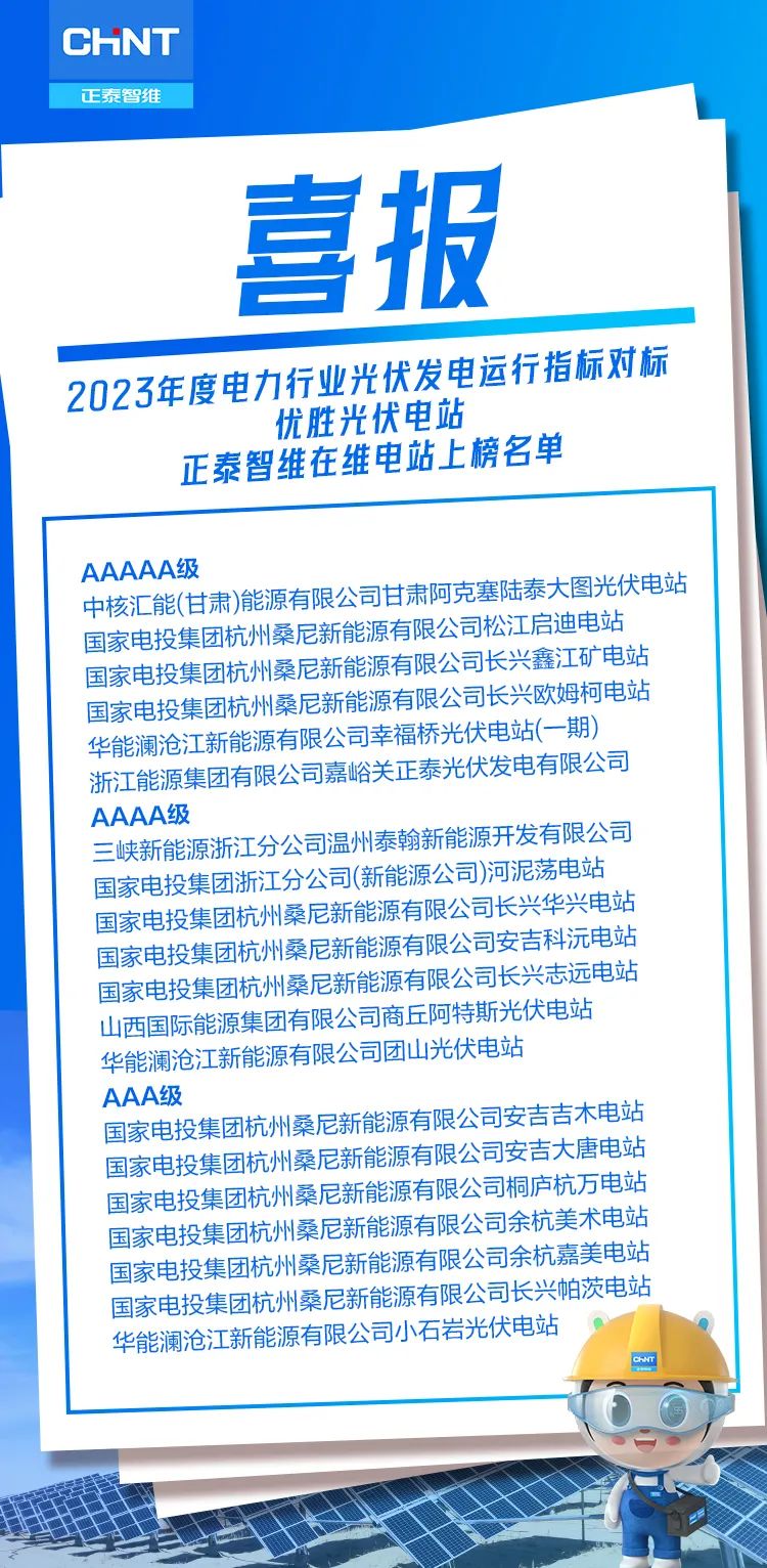 近日,中电联发布《关于公布2023年电力行业光伏发电运行指标对标的通知》,正泰智维在维电站共有20个电站上榜,6个电站获5A级评定,充分展现了正泰智维优异的资产管理能力和光伏电站运营水平。