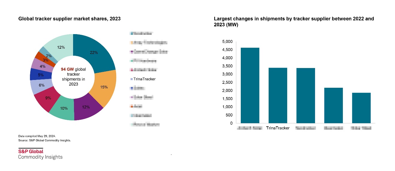根据标普全球统计数据,2023年全球跟踪支架出货量天合跟踪排名第六,全球市占率6%,较前一年增加100%,业务增长量全球第二,是增长速度最快的企业之一。 伍德麦肯兹报告指出,天合跟踪全球业务增长量第一,在南美、中东等地区排名前三。