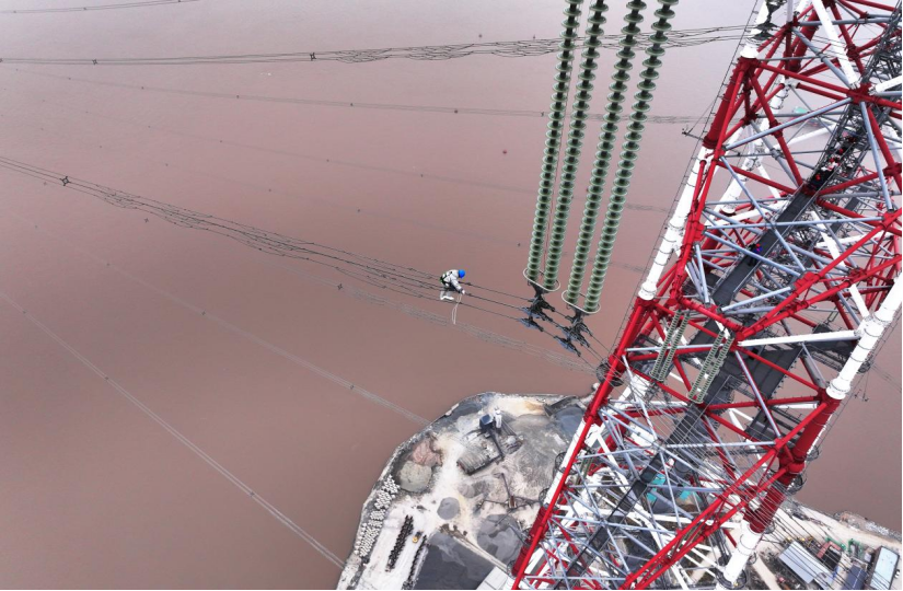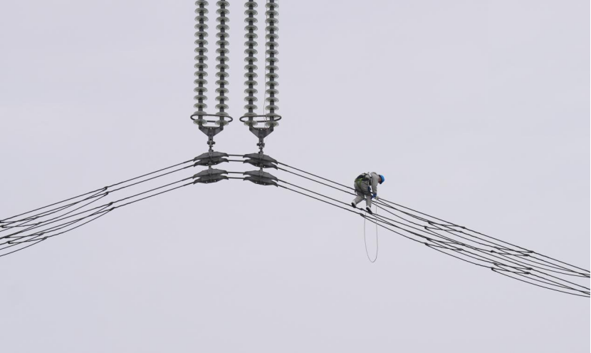 白义夫看着羞涩,但爬塔走线却有真本事。不一会儿,他就从37片青色瓷瓶爬到输电线路的起始端,手扶导线,在比瓶盖稍粗一点的导线上逐步行进。输电线路呈现月牙状,最高处有380米,但最低点不到100米,相当于要从百层高楼爬下再逐步攀上,单程一趟就需花费两个多小时。