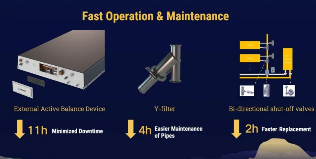该系统运维方面,首次采用外置主动均衡设备,实现系统不停机电池压差平衡,有效减少运维时间达11小时,保障系统在线率高效高可靠运营;同时其采用单包维护技术,无需注排液,管路拔开即停,即插即用;此外通过采用管路防脏堵设计,水路脏堵维护工作量可减少80%。