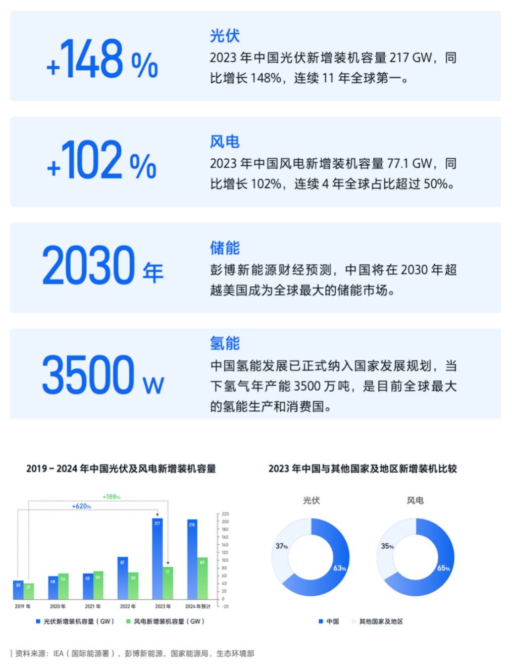 白皮书指出,中国新能源行业是国家能源战略的重要组成部分。在“十四五”规划纲要的引领下,新能源产业被赋予了战略性新兴产业的地位。过去几年,光伏、风电、氢能、储能等细分领域发展态势良好。2023 年,中国光伏新增装机容量 217GW,连续 11 年全球第一,风电新增装机容量达到 77.1 GW,成为推动我国能源结构优化的重要力量。中国完整的产业配套体系,涵盖了从上游的原料加工、零部件制造,到中游的组件、整机设备,再到下游的电站运维管理、发电系统管理等各个环节,对应万亿级别的工业及服务业产值,在全球具有相当的竞争力。