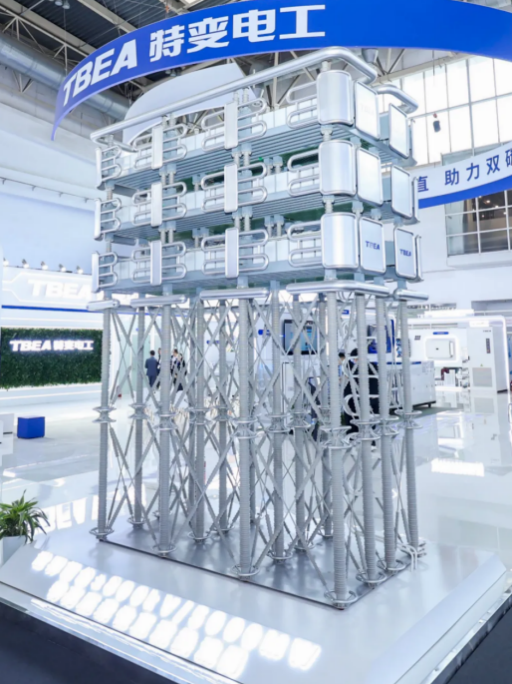 此次展台上,闪亮出场还有特高压柔性直流换流阀装备和TSVG系统解决方案。换流阀是柔性直流输电的心脏,是直流电和交流电相互转换的桥梁,在柔性直流主设备中技术含量最高、挑战最大。相比于常规特高压直流,特高压柔性直流输电大大降低了新能源发电输送系统的整体成本,有助于将清洁能源传输得更远、更平稳。