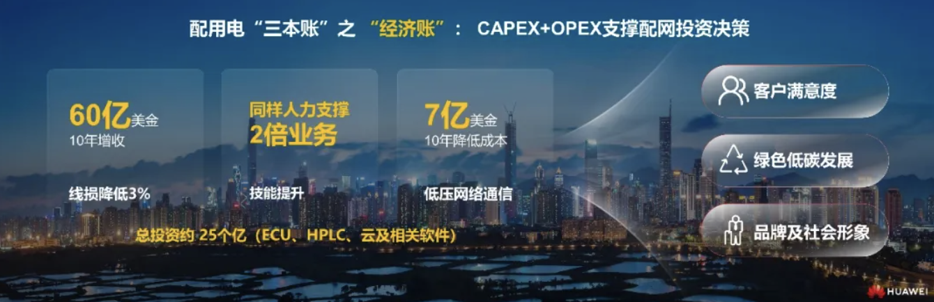 算经济账,即通过量化的投资回报率(ROI)评估,支撑企业快速决策。以某个国家华为智慧配用电解决方案(IDS)10年生命周期为例,其所涉及的资本性支出+运营成本(CAPEX+OPEX)总额为25亿美金,若以3%线损降低保守数据估计,企业将增加收益60亿美金。在生命周期内,自建通信网方案节约运营成本约为7亿美金,而且实际光纤生命周期超过30年。
