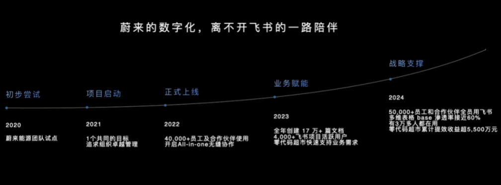从 2020 年充换电团队开始试点,到 21 年我们开始设定共同的目标,到 22年我们开始 all in one 地去用,然后到现在我们上万多员工加上 2 万多合作伙伴的员工都在全员用多维表格,渗透率接近 60%。零代码超市替蔚来省了 5, 500 万。