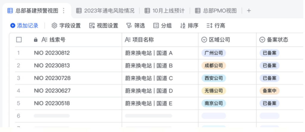 现在他们用得挺好,是整个公司的标兵。我们的换电站遍布全国 48 个区域,包括拉萨,包括乌鲁木齐,每一个换电站都是投资几百万的一个项目,如果没有飞书多维表格,我觉得是做不到的。