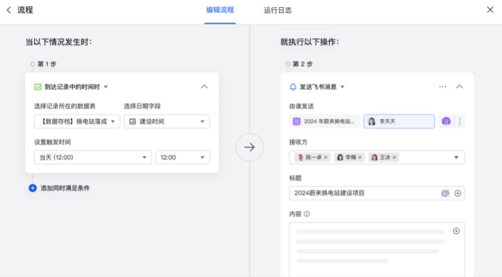 李斌以换电站这个典型的场景为例,介绍了飞书在蔚来内部扮演的重要协同角色。“我们的换电站遍布全国 48 个区域,如果没有飞书多维表格,我觉得是做不到的。”他分享说。