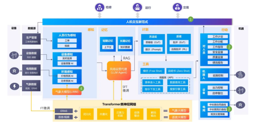 由大模型提供智力的风场运营总代理(LLM Agent)不再依赖传统自动化的If else规则开展行动,而是像人类一样,基于感知、记忆、计划和工具来管理线上世界,并作用于物理世界。