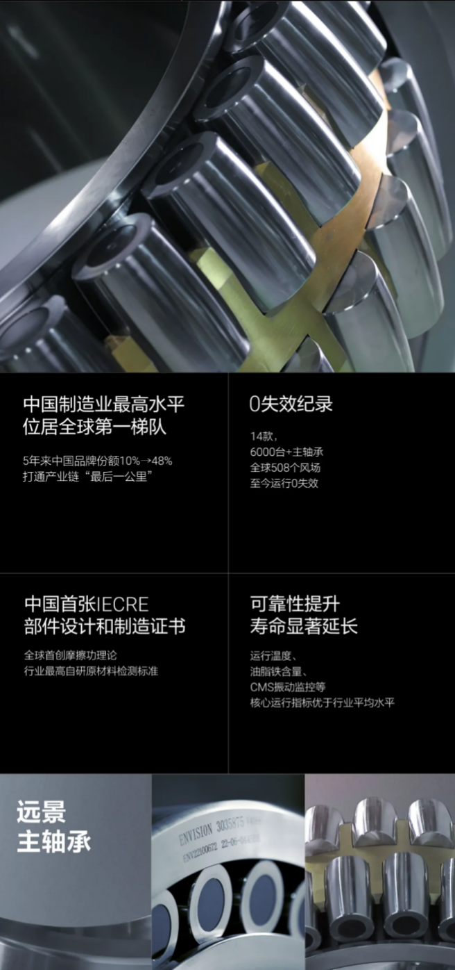 远景主轴承(EnG)代表中国制造业最高水平,位居全球第一梯队,自2019年首台自研主轴承成功应用至今,14款自研主轴承累计交付6000台运行零失效,应用于全球508个风场项目,涵盖2-16MW风机容量。5年来,远景成功将中国风电主轴承品牌的市场份额从10%提升至48%,并将于2024年底提升至70%以上,彻底打通风电产业链卡脖子的“最后一公里”。远景将全球首创摩擦功理论和技术应用到风电领域,基于创新理念设计的远景主轴承采用自研轴承原材料标准和检测要求,是当前行业的最高标准。远景主轴承加载30年等效现实工况加速疲劳测试,可靠性大幅提升,运行温度、油脂铁含量、CMS振动监控等核心运行指标均优于行业平均水平,使用寿命显著延长。除此之外,适配不同应用场景的远景主轴承定制化设计可以实现每台风机的差异化运维。