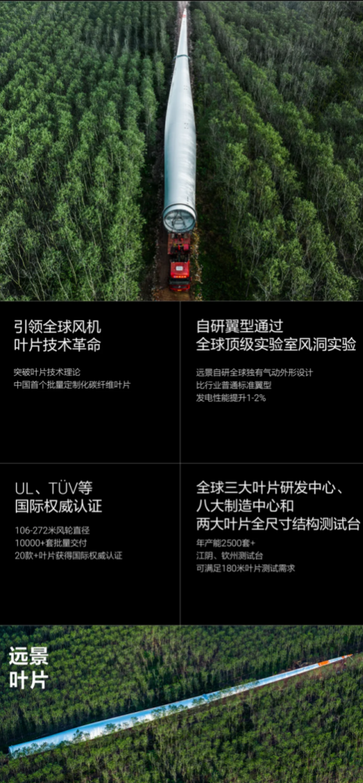 远景叶片(EnB)引领全球风机叶片性能革命性升级,远景美国科罗拉多全球叶片创新中心与上海总部深度协同,从2013年起不惜成本突破叶片技术理论,自研全球独有气动外形设计和全新碳叶片加强结构拓扑,与整机控制优势深度整合。远景叶片采用独创自研翼型,每一款翼型都经过全球顶级实验室风洞实验,发电性能相比行业普通标准翼型提升1-2%。远景叶片八大自制中心遍布全球,年产能超2500套,截至目前远景自研叶片批量交付超10000套。远景叶片匹配远景海陆智能风机,中国首个批量定制化碳纤维材料叶片充分发挥高刚度、轻量化特性,风轮直径覆盖106-272米,在江阴远景智慧风电测试中心通过静力、扭转、双轴疲劳等叶片全尺寸结构测试,20余款叶片获得UL、TÜV等国际权威认证。面向深远海,广西钦州远景叶片全尺寸结构测试台预计2025年投运,满足180米叶片的测试需求。