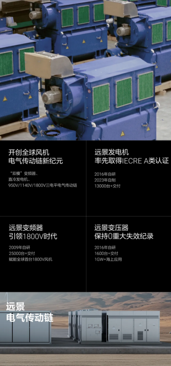 “双模”变频器、直冷发电机、950V/1140V/1800V三电平电气传动链……远景开创全球风机电气传动链技术新纪元,每次技术突破逐步成为行业标配。远景发电机从2016年起自研并于2023年建厂自制,产品率先在国内取得IECRE A类认证,累积交付超13000台,质量表现远远优于行业水平。远景变频器自研历史可以追溯到2009年10月,率先解决中国风机行业痛点,提高整机的系统性能和寿命,截至目前已累计交付超25000台,赋能全球首台1800V大兆瓦双馈风机。远景变压器从2016年起累计交付超1600台,配套远景风机和储能系统,出口到摩洛哥、埃及、沙特、乌兹别克斯坦等国家,海上风电项目应用超1GW,批量产品至今保持0重大失效纪录。